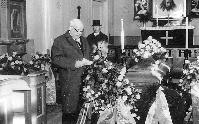 Titel: Nitaho-Jussis begravning. Kapten Harry Eld Koupie framförde president Kekkonens sista hälsning till Nitaho-Jussi. Prestaverare Axel Andersson, Bjurberget.