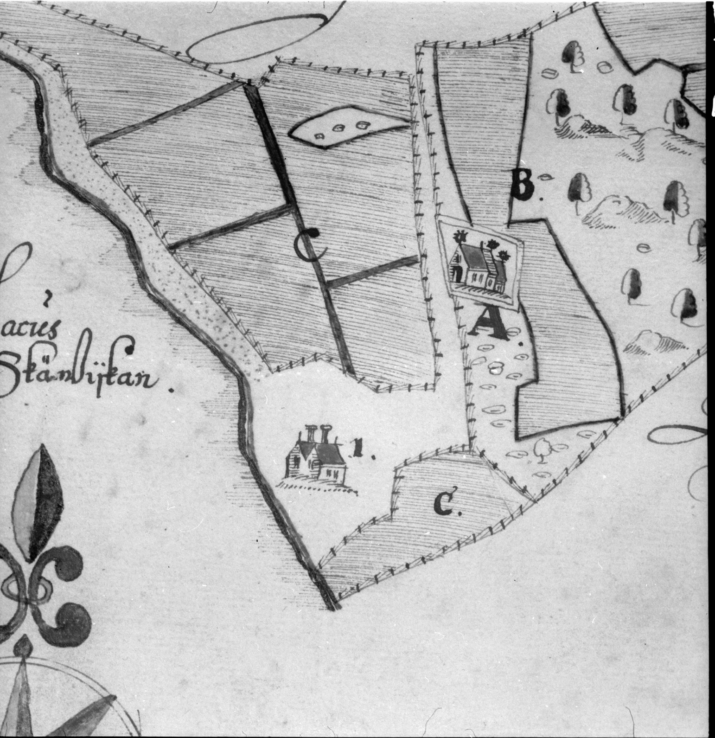 Kyrkan och dess omgivning. Foto efter karta av Sven Månsson 1640-41.