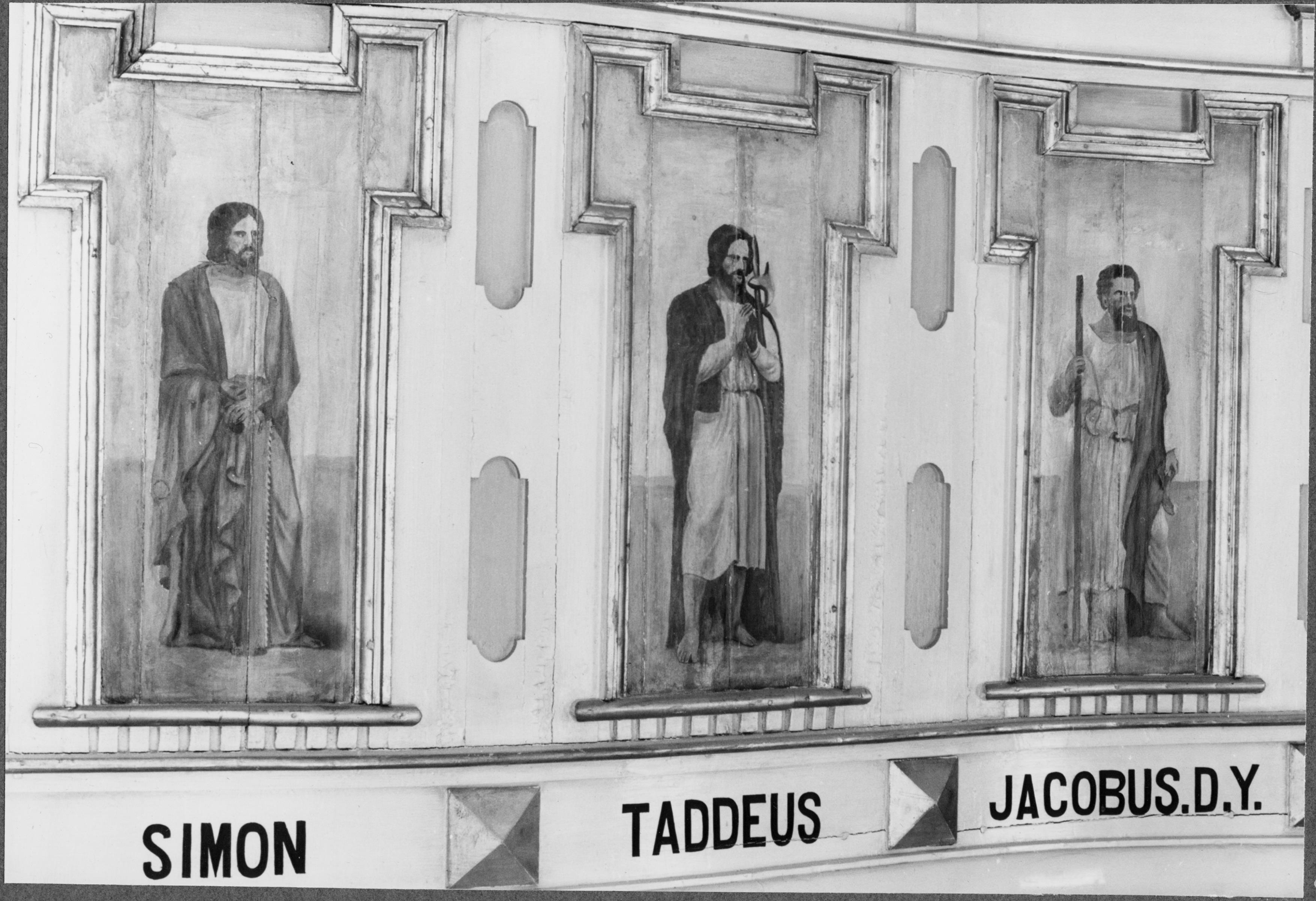 Läktarbröstning med bilder på apostlarna; Simon, Taddeus och Jacob den yngre.
