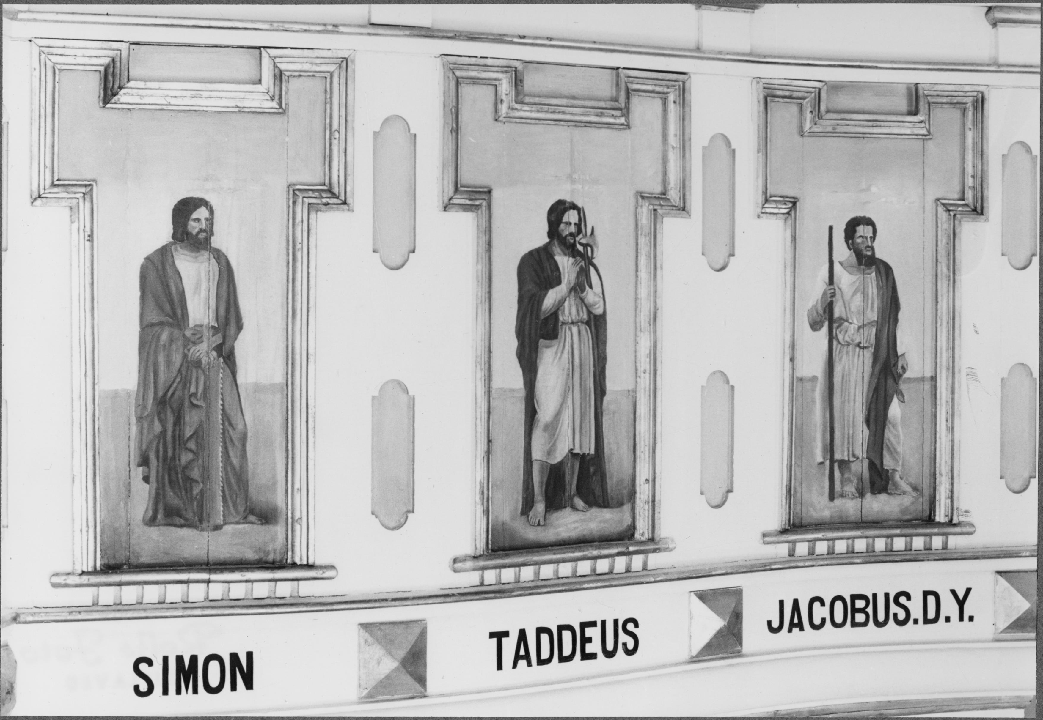 Läktarbröstning med bilder på apostlarna; Simon, Taddeus och Jacob den yngre.