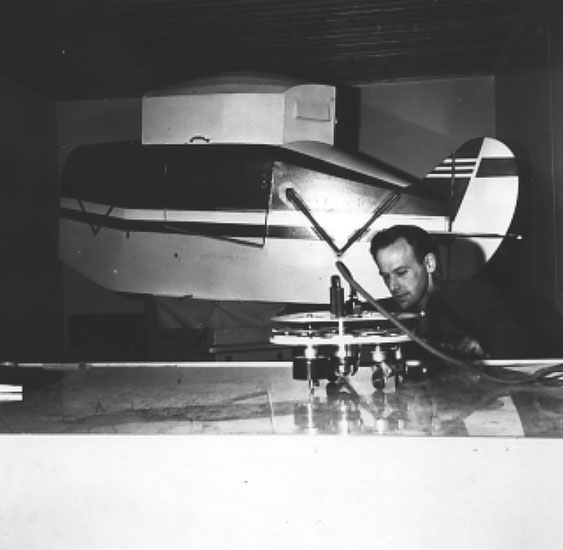 Sven-Olof Marklars studerar på manöverbordet flygsimulatorns rörelser.