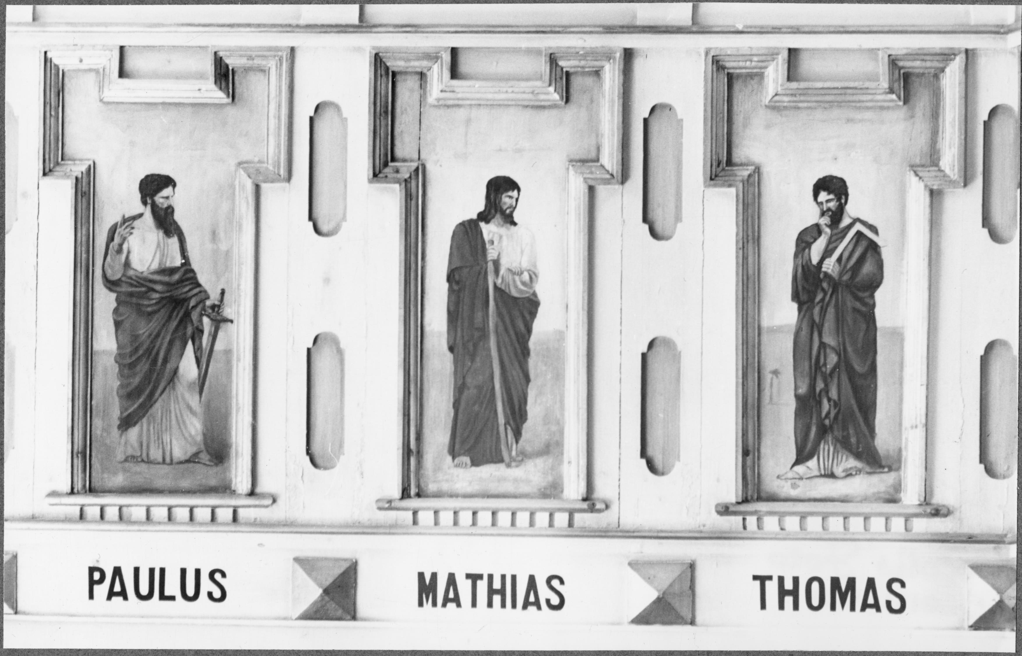 Läktarbröstning med bilder på apostlarna; Paulus, Mathias och Thomas.