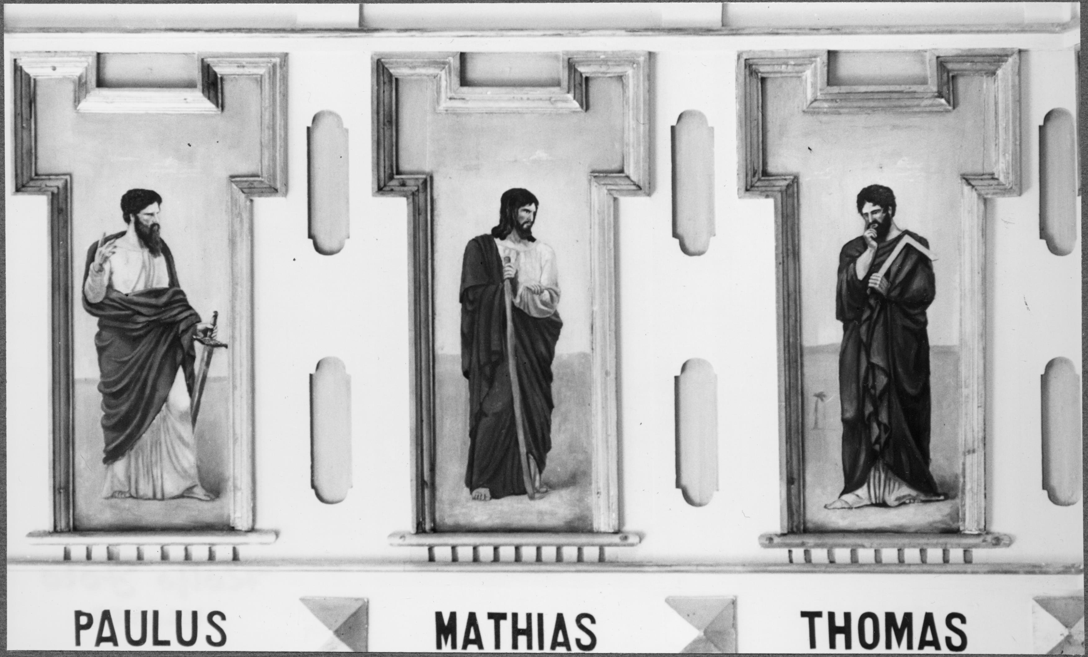 Läktarbröstning med bilder på apostlarna; Paulus, Mathias och Thomas.