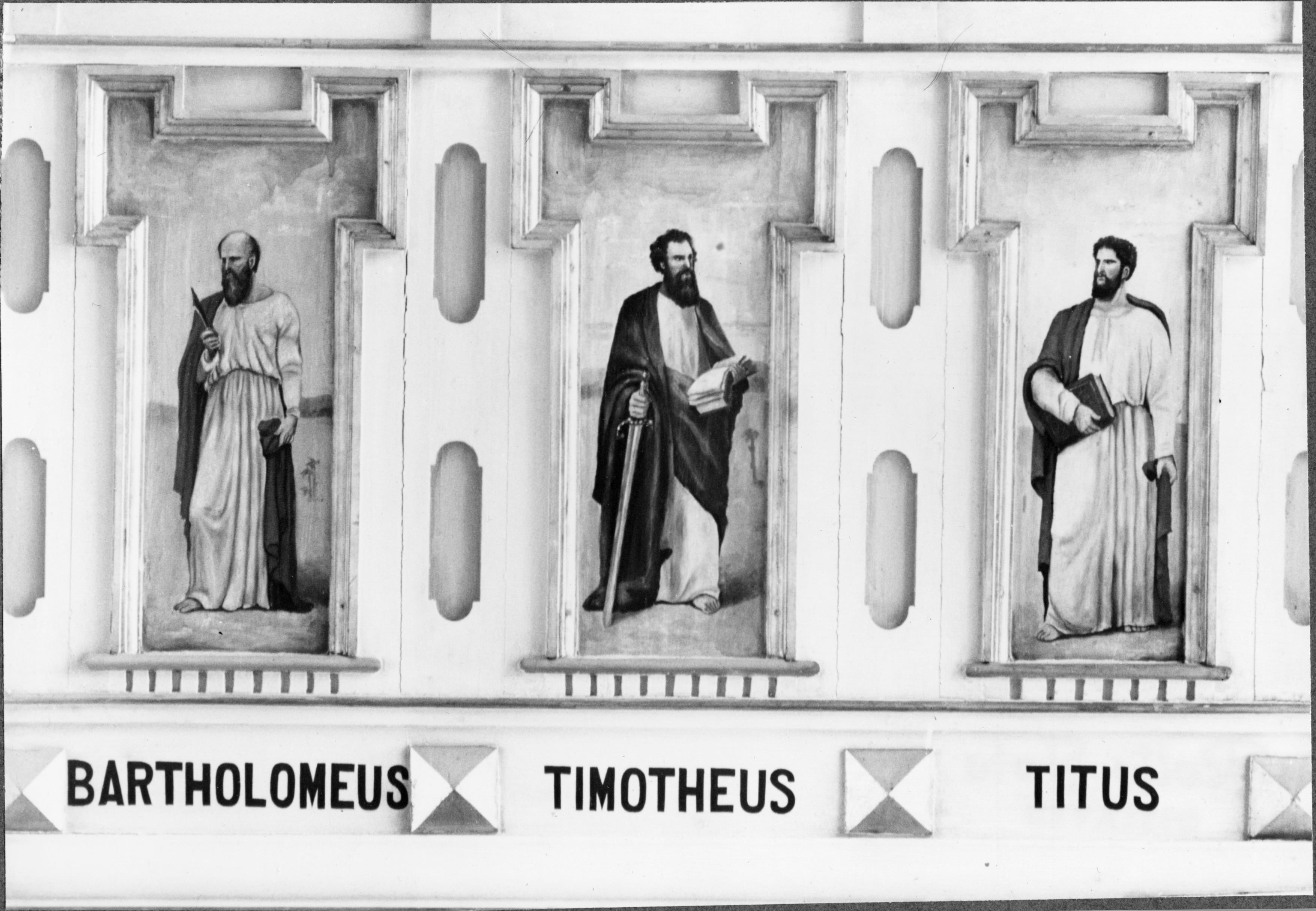Läktarbröstning med bilder på apostlarna; Bartholomeus, Timotheus, Titus. (De två senaste ej "riktiga" apostlar.)