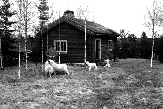 Titel: Man och får framför knuttimrad stuga. Fotografens ant: Konsulent Rystedt.