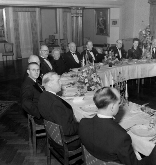 Män och kvinnor vid dukat långbord.