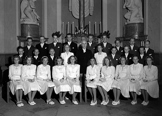 Större grupp pojk- och flickkonfirmander samt pastor Engström i Domkyrkan.