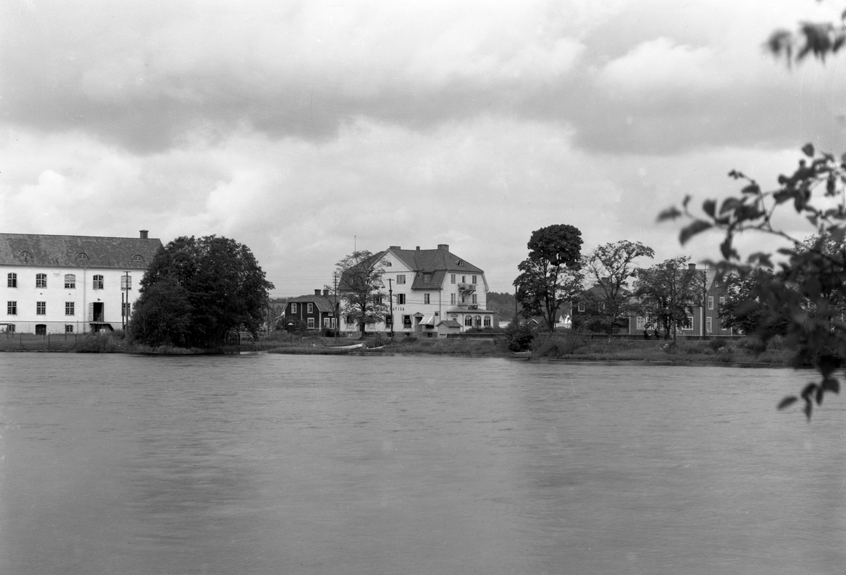 Klarälven i böjen vid Klaravik år 1931. Förutom en komsumbutik fanns det också ett konditori vid namn Solbacka på gaveln i mittersta huset.