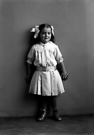 Flicka med klänning och rosett.