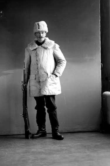Man i pälsfodrad rock och pälsmössa.