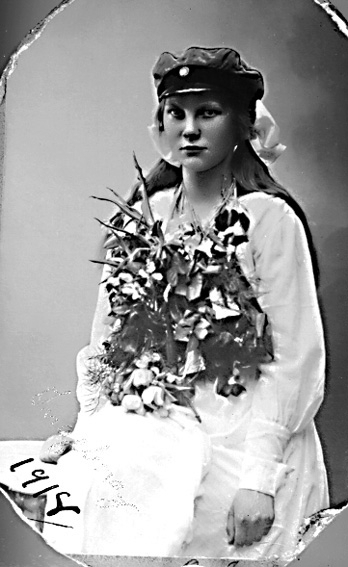 Flicka i samband med examen; realmössa samt blommor hängande om halsen.