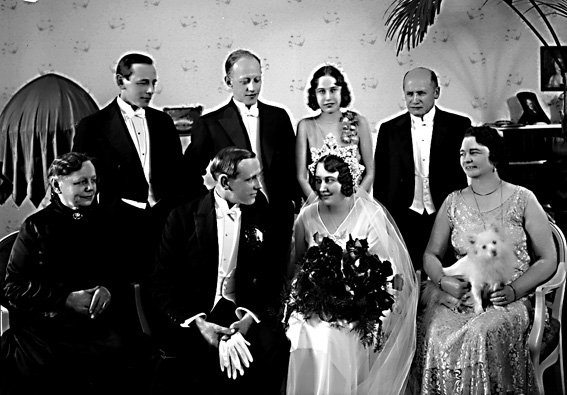 Grupp med brudpar i centrum.