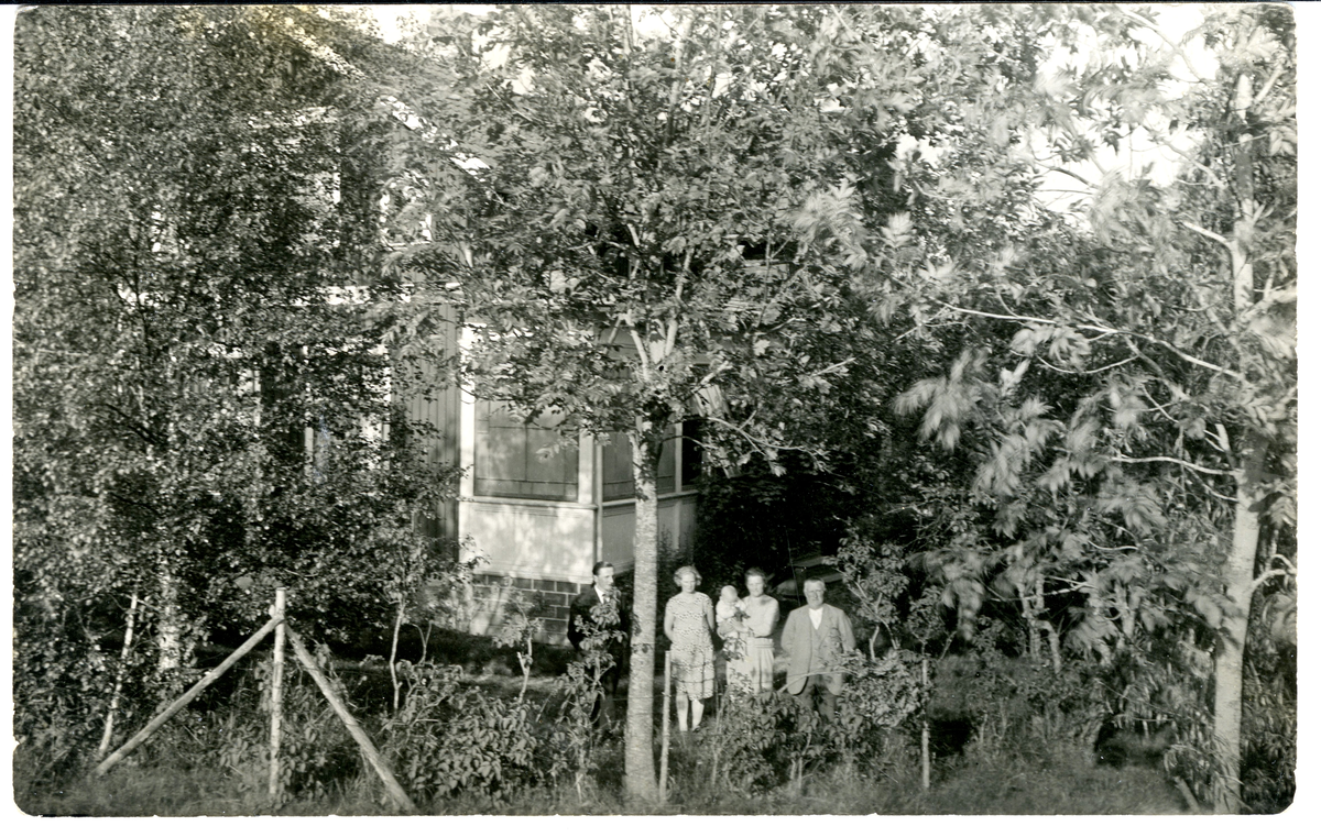 Gruppbild framför hus i Grunnerud. Enok och Dagny Sundling till höger.