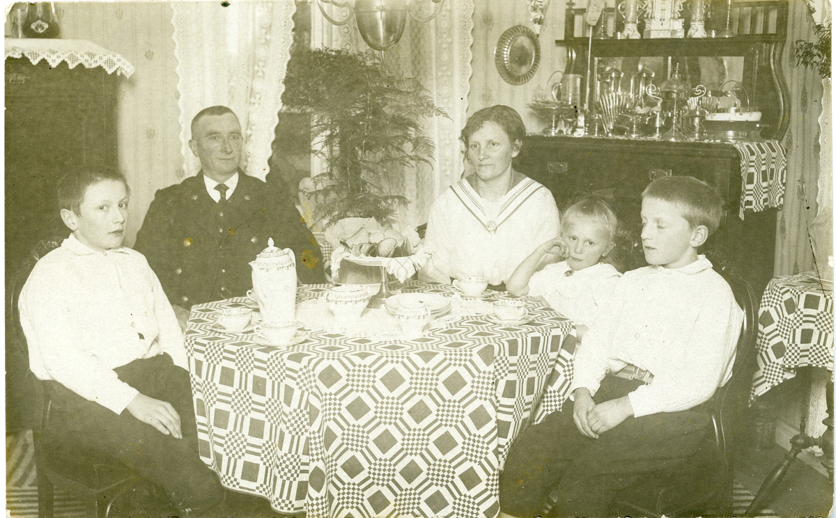 Familjen Sundling vid kaffebord. Från vänster: Georg, Enok, Dagny, Karin och Harald.