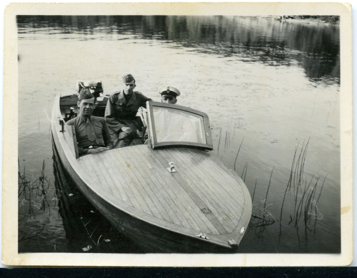 Tre män med uniform i båt, Haralnd Sundling till höger.