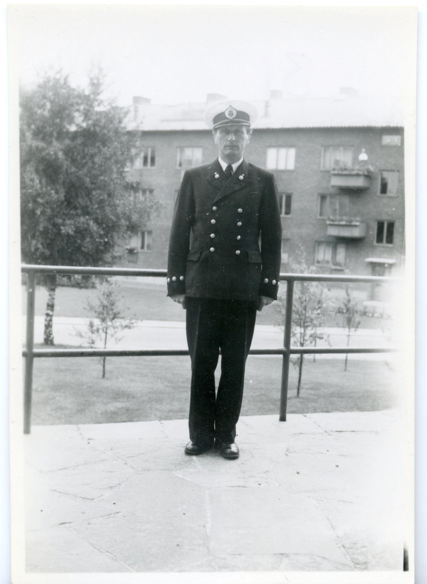 Georg Sundling iklädd uniform poserar för fotograf framför byggnad.