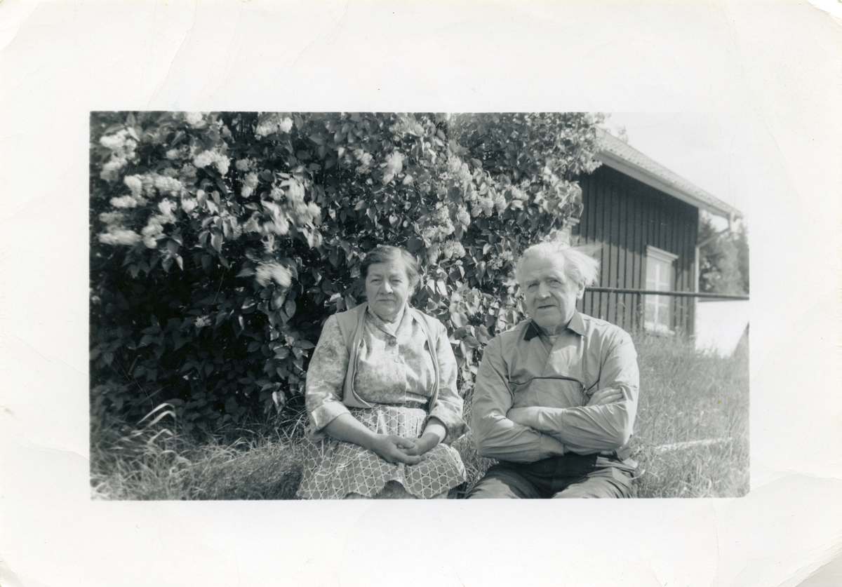 Par, Gerda och Melker Dalman sitter framför syrenbuske vid byggnad.