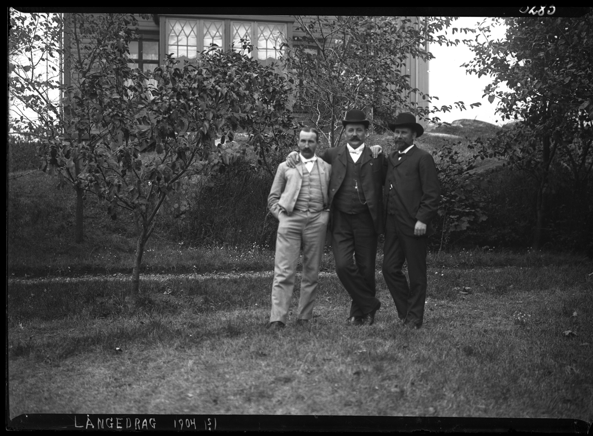 På kuvertet står följande information sammanställd vid museets första genomgång av materialet: Långedrag. 3 st män i trädgård. M.D.G Edholm, Gjuterichef A. Edholm och jag.