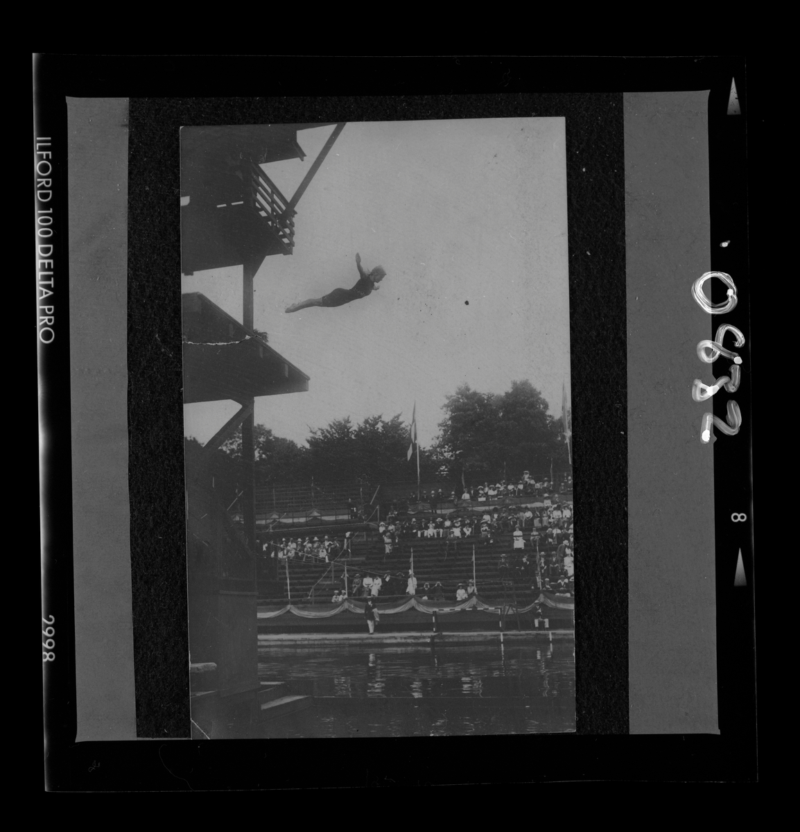 På kuvertet står följande information sammanställd vid museets första genomgång av materialet: Olympiska spelen, Greta Johansson i raka hopp.