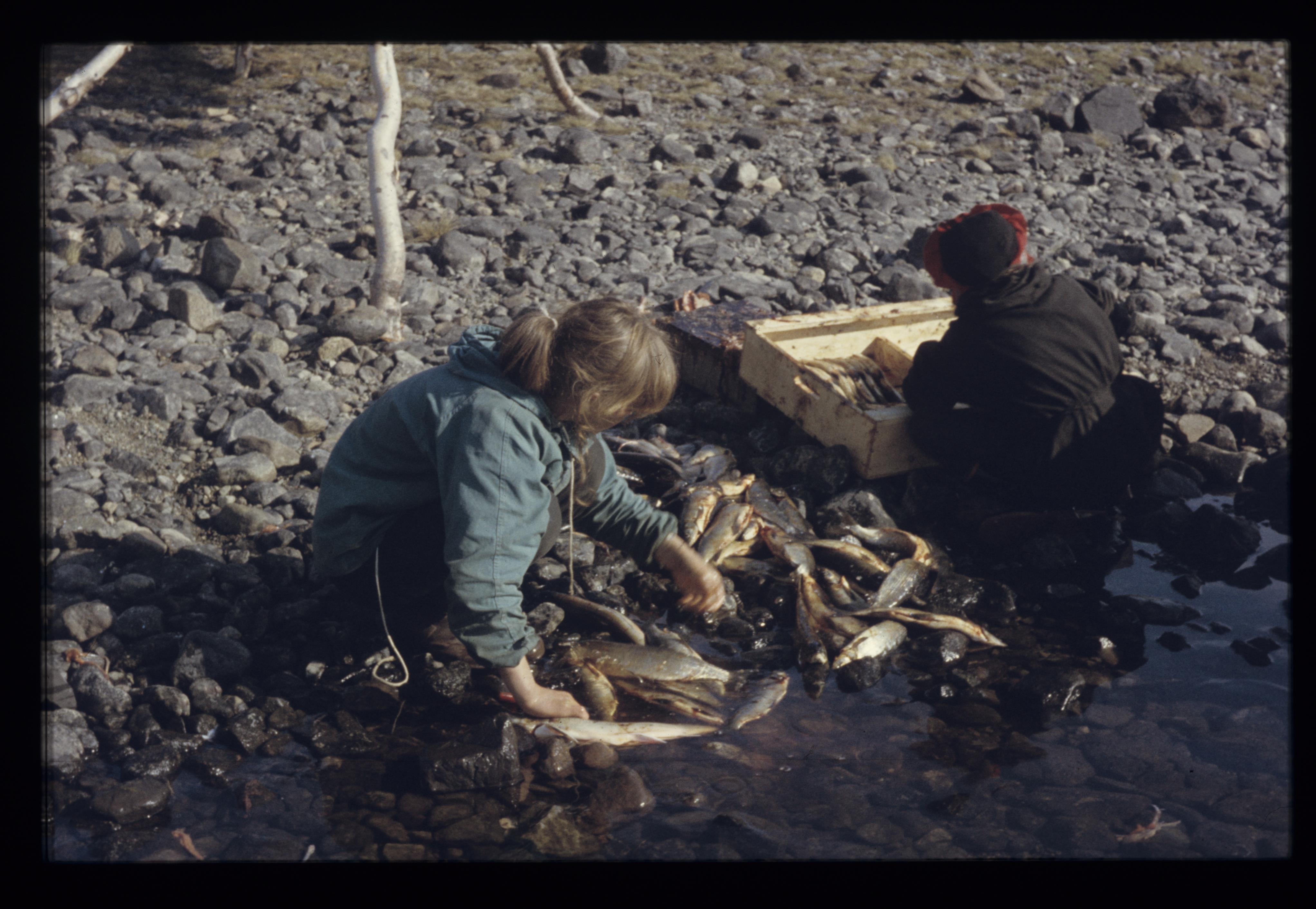 Vid Satisjaure. Laponia. Ingår i Sjaunja naturreservat. Rensning av fisk.