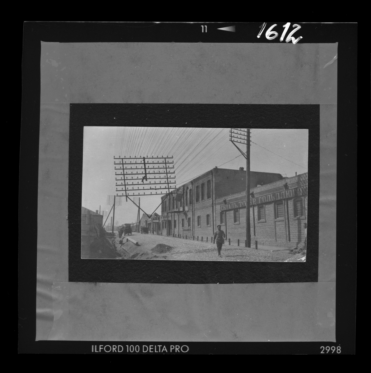 På kuvertet står följande information sammanställd vid museets första genomgång av materialet: Baku. Från oroligheterna, som började redan år 1872. En avsjuten telefonstople i Bibi-Ejbatt.