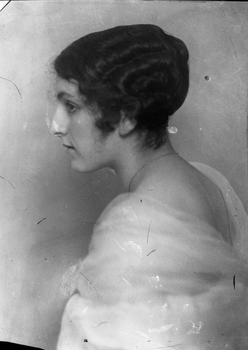 Porträtt, profil av kvinna i vit dräkt.