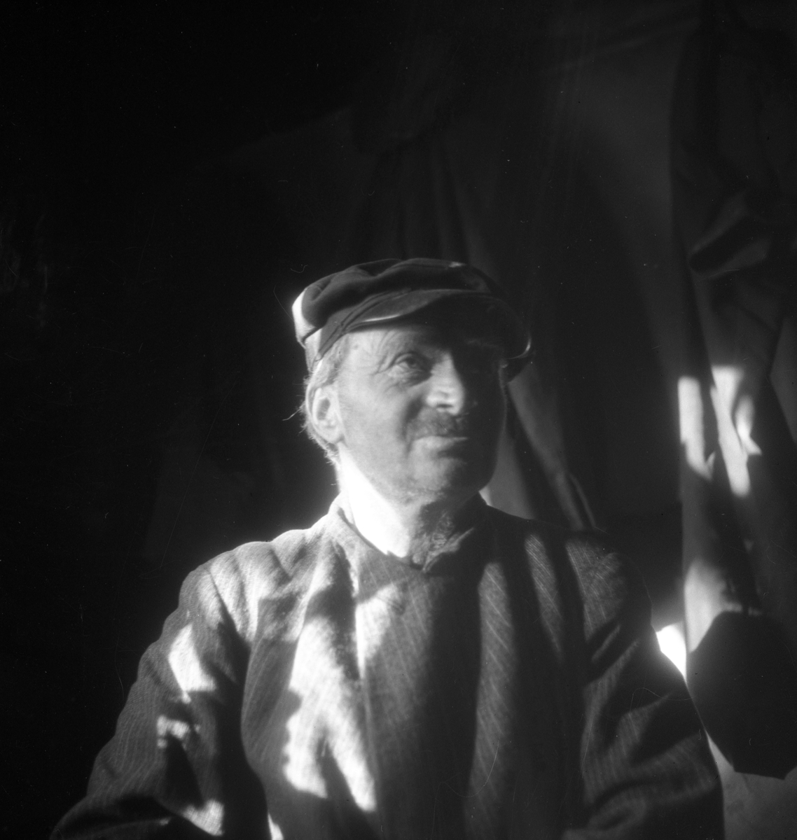 Bror och Karl Andersson i sin hemsnickrade stuga som var tillverkad av lådor från J P Nyströms orgelfabrik och låg på Kaplansholmen i östra älvgrenens delta. De gick även under namnen "Brollan" och "Kalle Geta". Bröderna livnärde sig som fiskare och sålde dagens fångst vid strandhugg inne i Haga. Mer att läsa om bröderna finns i Morgan Larssons bok: Karlstadsoriginal. Bilden togs 1941.