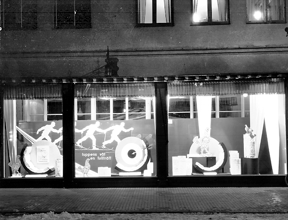 Bild tagen på kvällen i skyltfönstren hos Ekelöf & Svensson AB.
