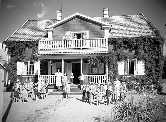 Större byggnad i trä med tegeltak. Framför byggnaden barn och vuxna.