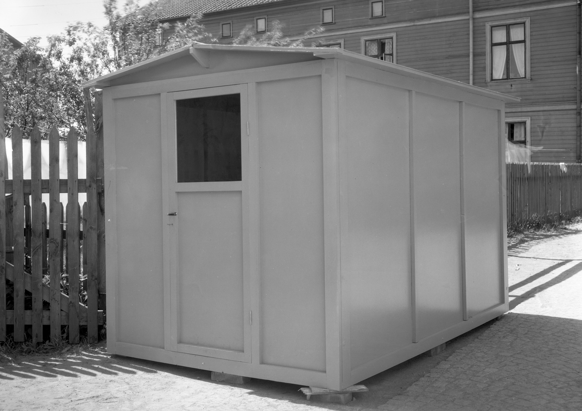 Förrådsbarack tillverkad av Handels AB Karl Olsson. Företaget handlade med järn, sågade trävaror m m och hade även en butik med försäljning av hushållsvaror i hörnet Karlagatan-Fryxellsgatan. Bilden togs 1933.