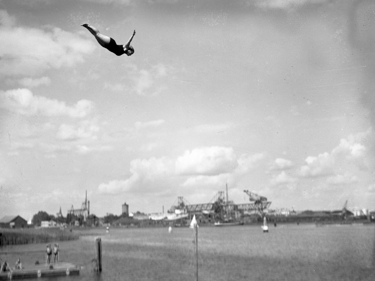 Bildserie från slutet av 1930-talet från Karlstads dåvarande simstadion. Anläggningen låg i anslutning till den s k badholmens östra sida söder om Kanikenäset. Badet invigdes 1923 och togs ur bruk och revs 1943 pga dålig vattenkvalité. En liknande konstruktion som ersatte den på bilderna byggdes upp i Örsholmstjärnet i början av 1950-talet.
