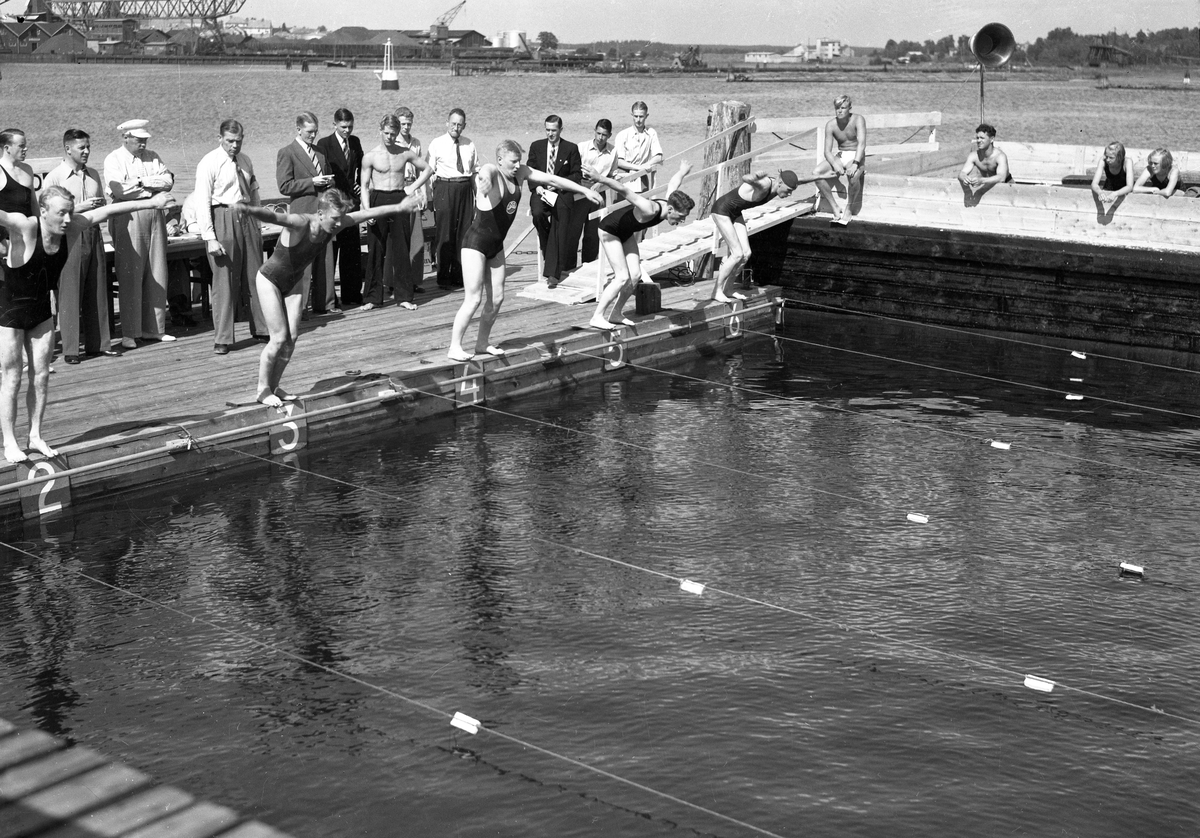 Bildserie från slutet av 1930-talet från Karlstads dåvarande simstadion. Anläggningen låg i anslutning till den s k badholmens östra sida söder om Kanikenäset. Badet invigdes 1923 och togs ur bruk och revs 1943 pga dålig vattenkvalité. En liknande konstruktion som ersatte den på bilderna byggdes upp i Örsholmstjärnet i början av 1950-talet.