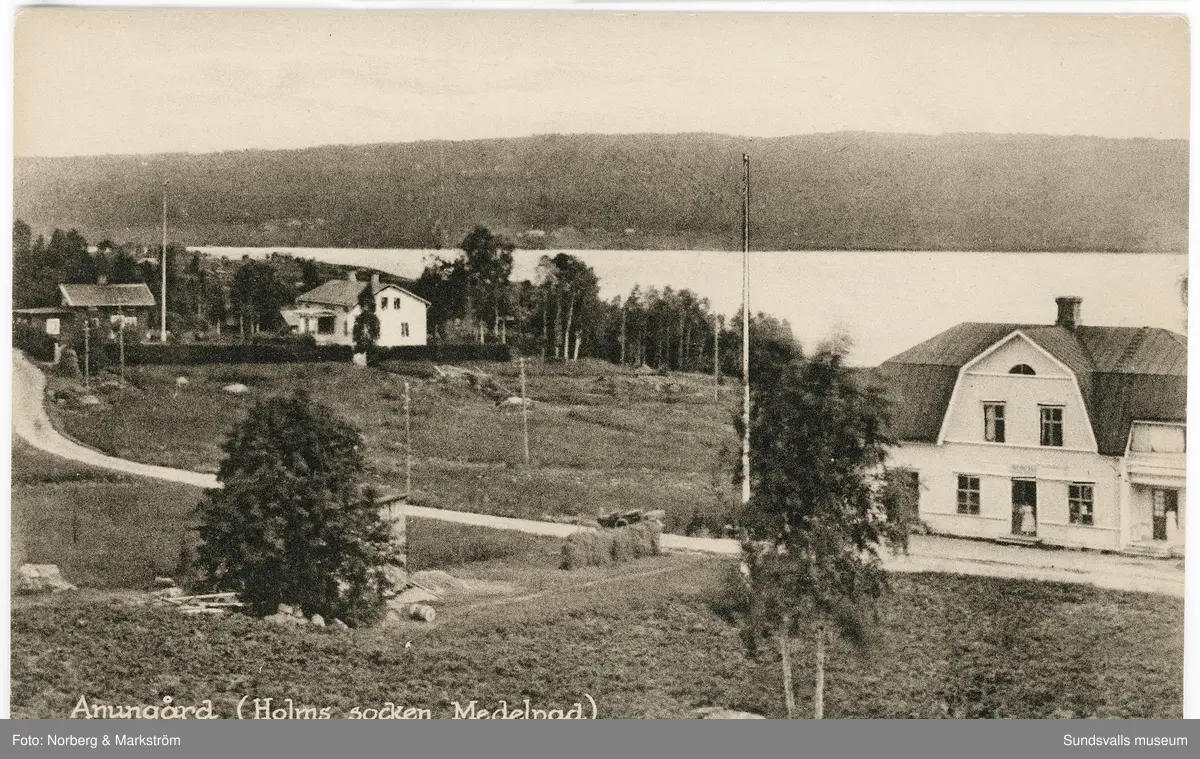 Vykort Anungård, Holms socken Medelpad. Lanthandel t h med bostad på övervåningen. Bostadsdelen används fortfarande (1987), men affärsverksamheten har flyttats till andra lokaler. Familjer knutna till huset är Åslin, Sundberg, Åslin-Hjelm. Vykort.