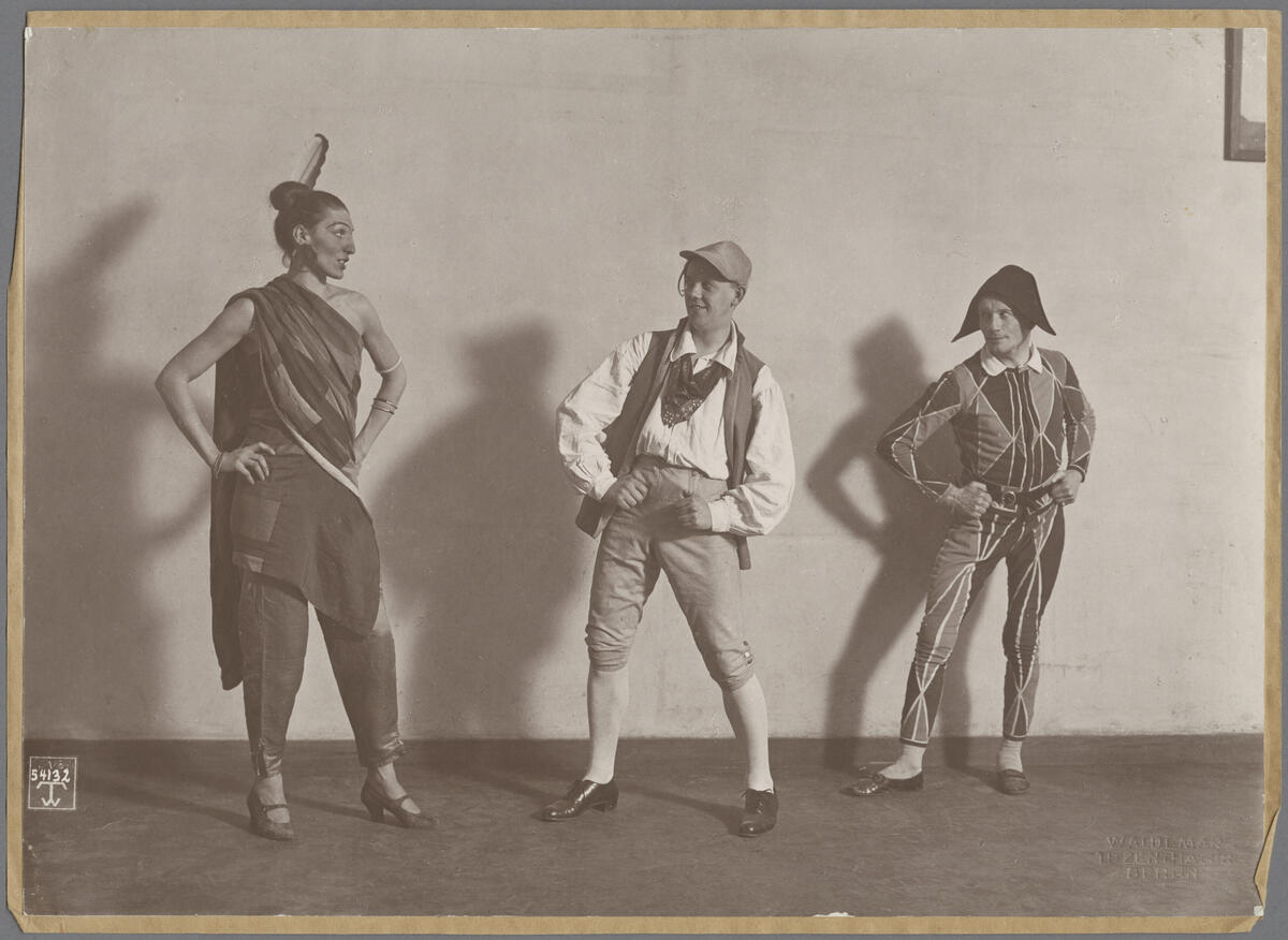 Skulptören Renée Sintenis, Jean Börlin och Professor Weiss (okänt förnamn) på maskerad på Kunstgewerbemuseum i Berlin.