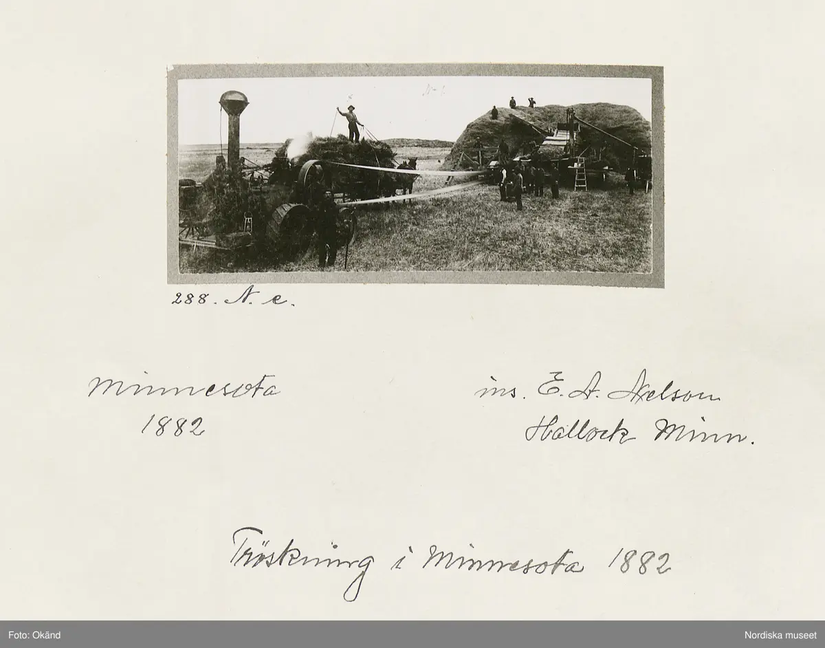 Text på monteringen i arkivet: Tröskning i (Hallock), Minnesota 1882.
