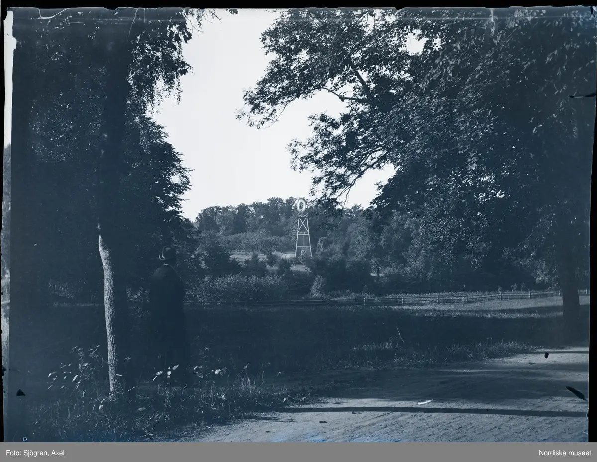 En man står och blickar mot ett vindkraftverk (?) längre bort i landskapet.