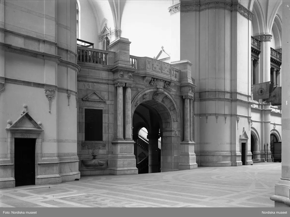 Nordiska museet, Stockholm. Interiör. Stora hallen med kröningsläktaren.