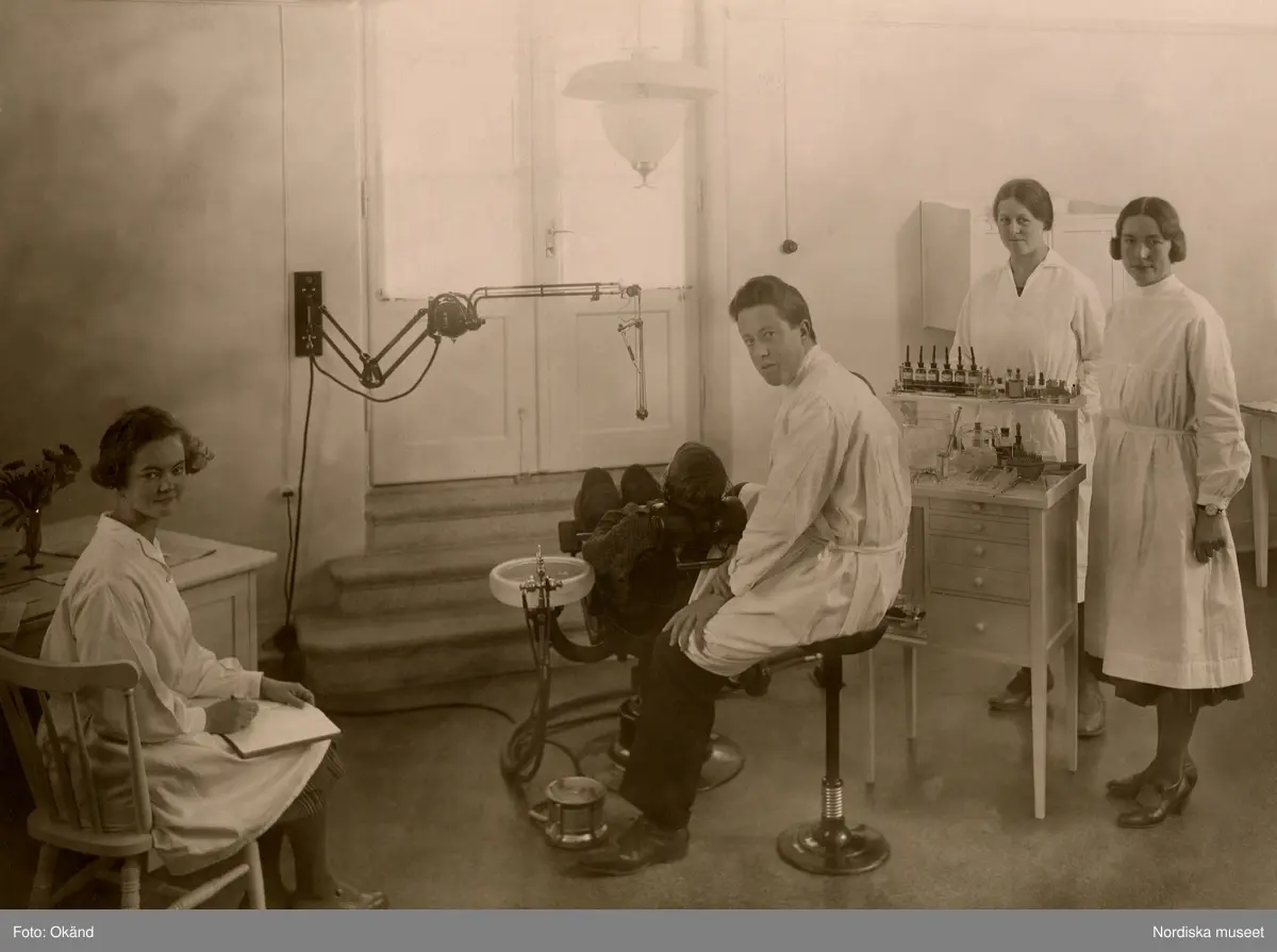 Skolläkarmottagning. En (tand?)läkare, tre sköterskor och en elev/patient i behandlingsstol.