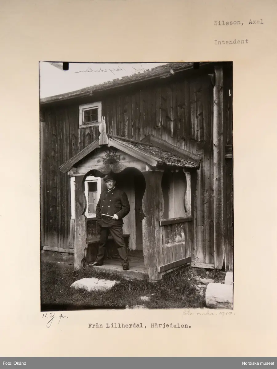 Intendent Axel Nilsson ståendes på en förstukvist i Lillherdal, Härjedalen. Foto monterat på ark.