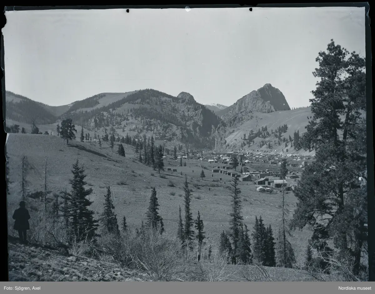 Vy över bergigt landskap och bebyggelse. Colorado, USA.