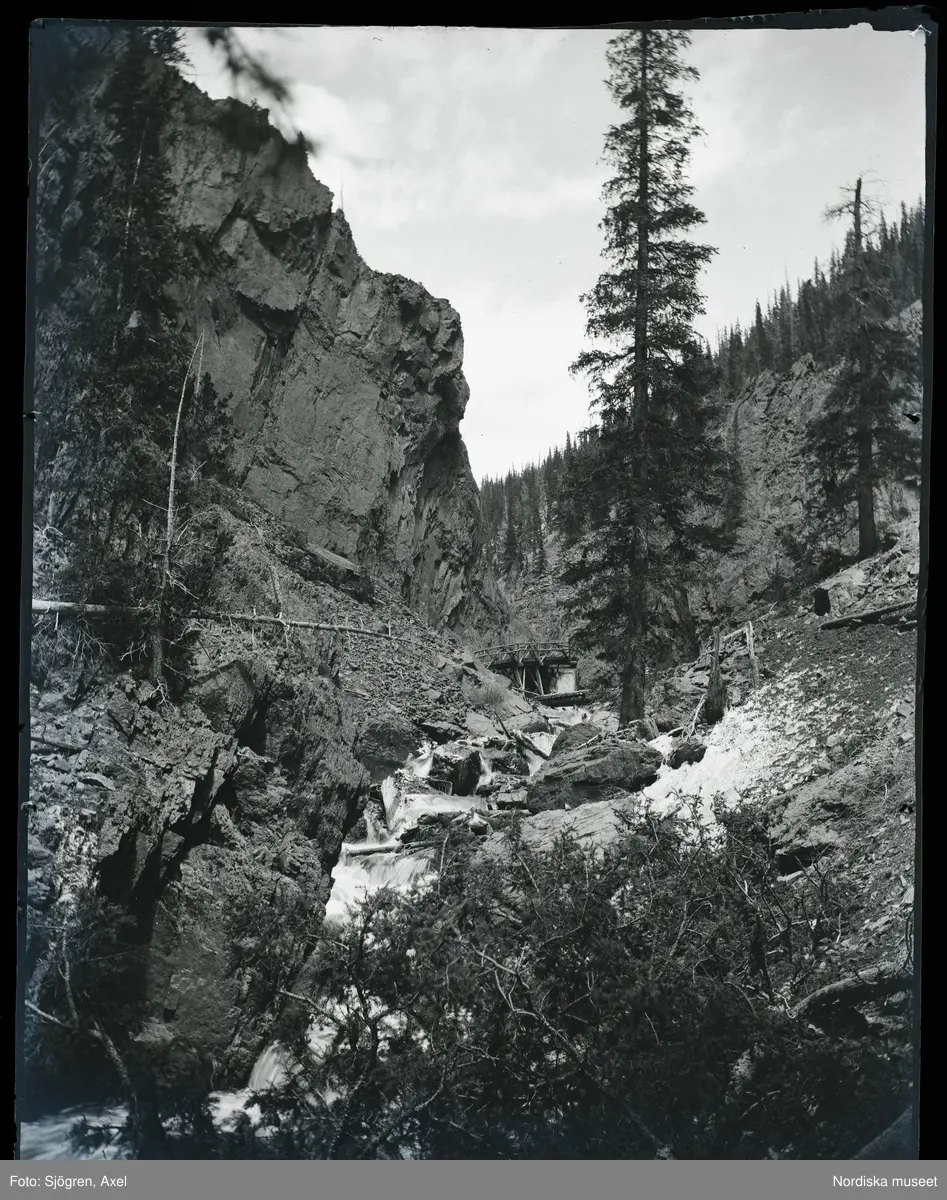 Vy över vattenfall, berg och skog. Förmodligen Colorado, USA.