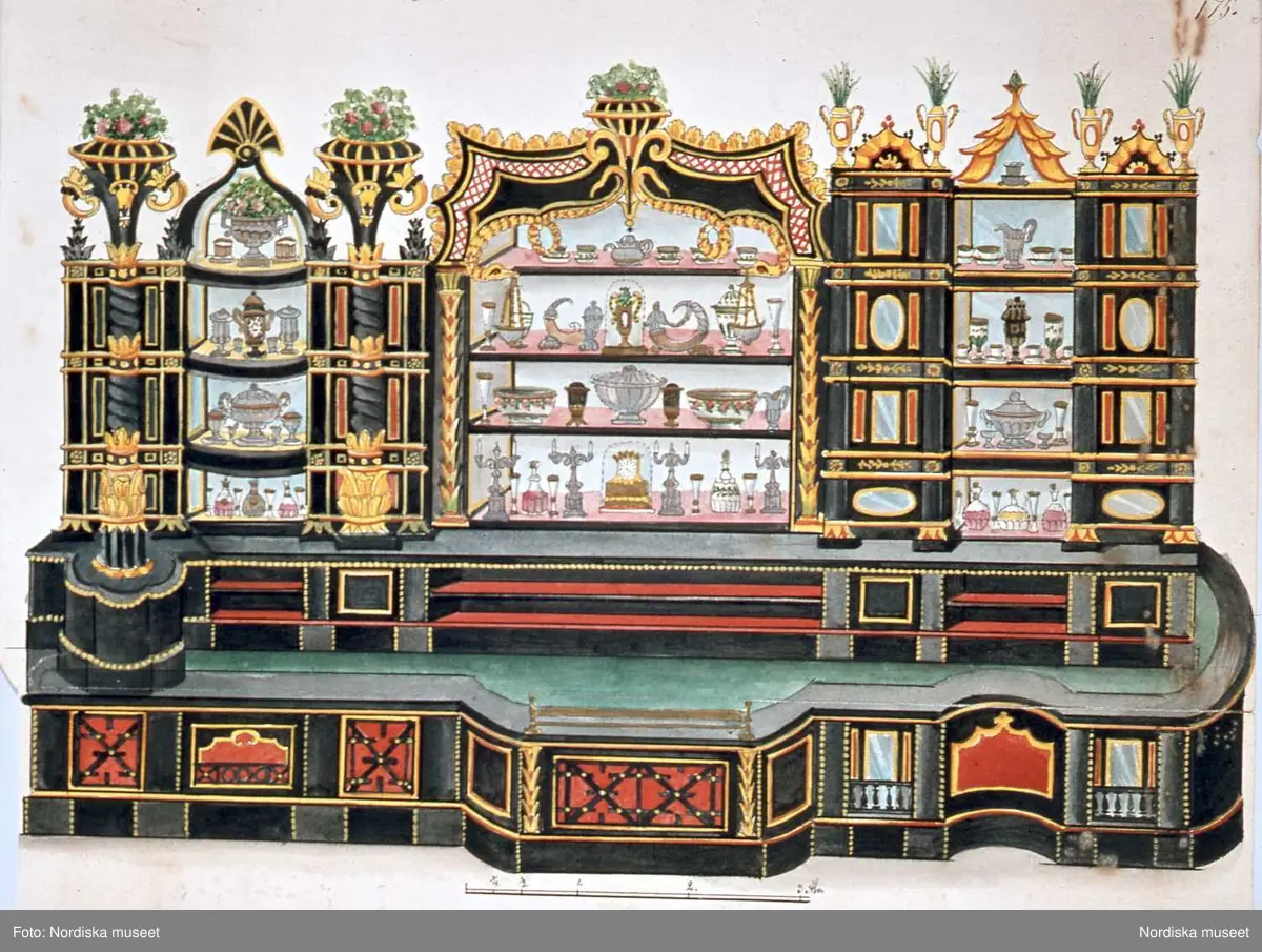 Butiksinredning ur en handritad och akvarellerad mönsterbok, som tillhört stockholmssnickaren Friedrich Rambach, verksam 1834-1861.