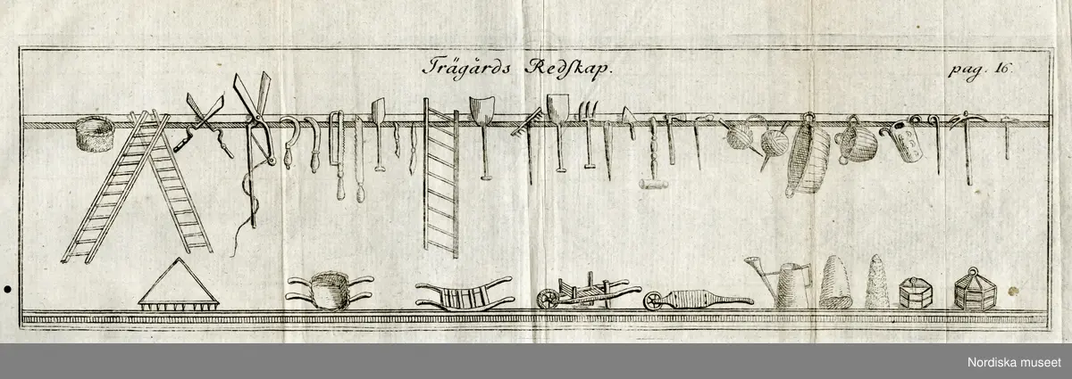 Plansch (kopparstick) med trädgårdsredskap ur Peter Lundbergs Trädgårdspraxis från 1763 (2:a upplagan).