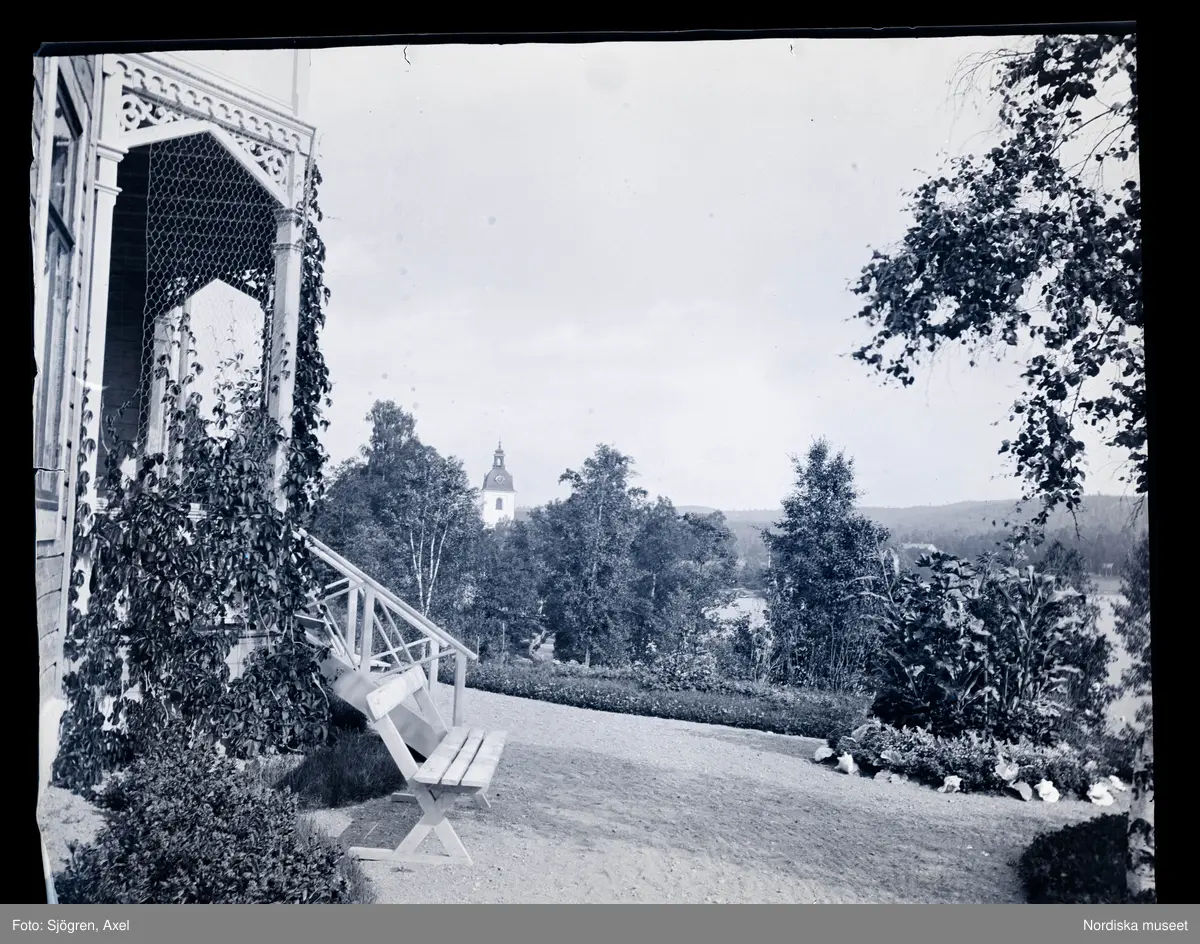 Vy över trädgård. En träbänk står placerad framför en altan med snickarglädje. I bakgrunden skymtar Filipstad kyrka.