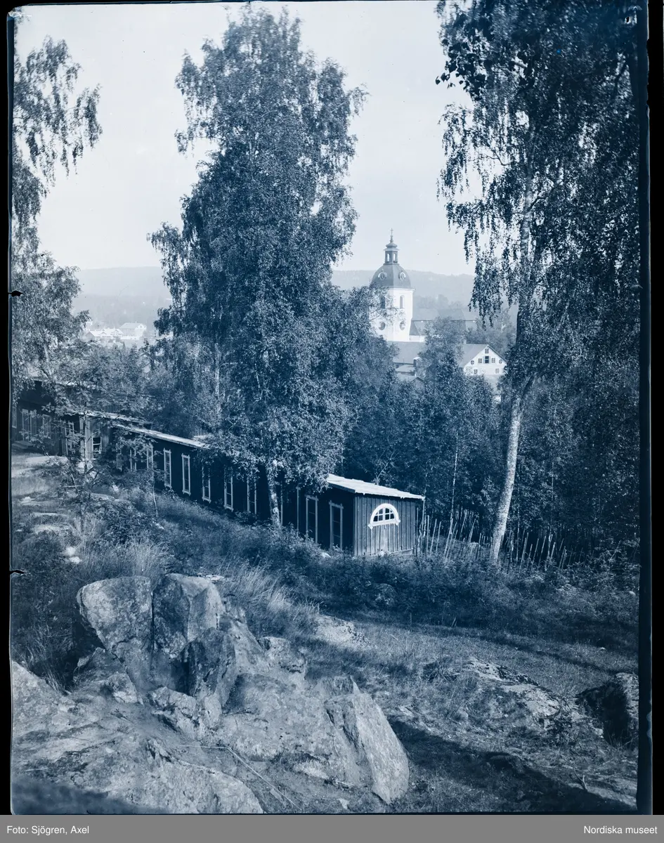Titel: Vy över låg byggnad, Filipstads kyrka i bakgrunden.