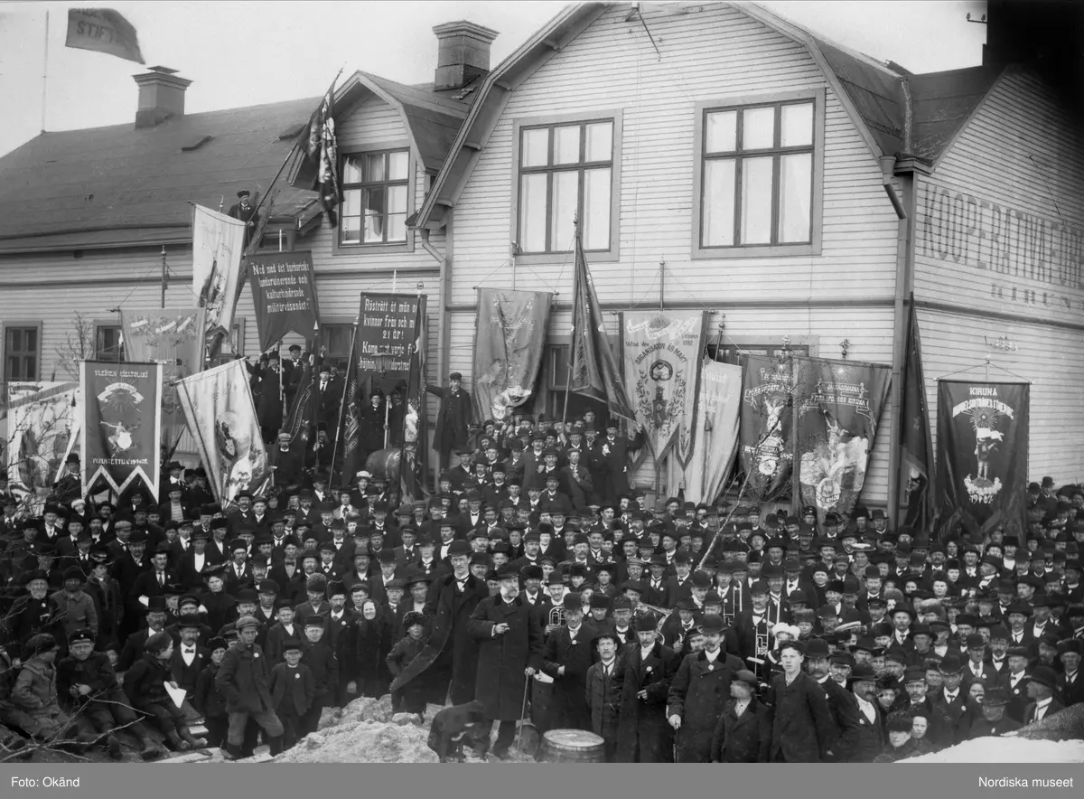 August Palm på besök i Kiruna. Arbetarorganisationerna samlade med fanor framför Folkets Hus.