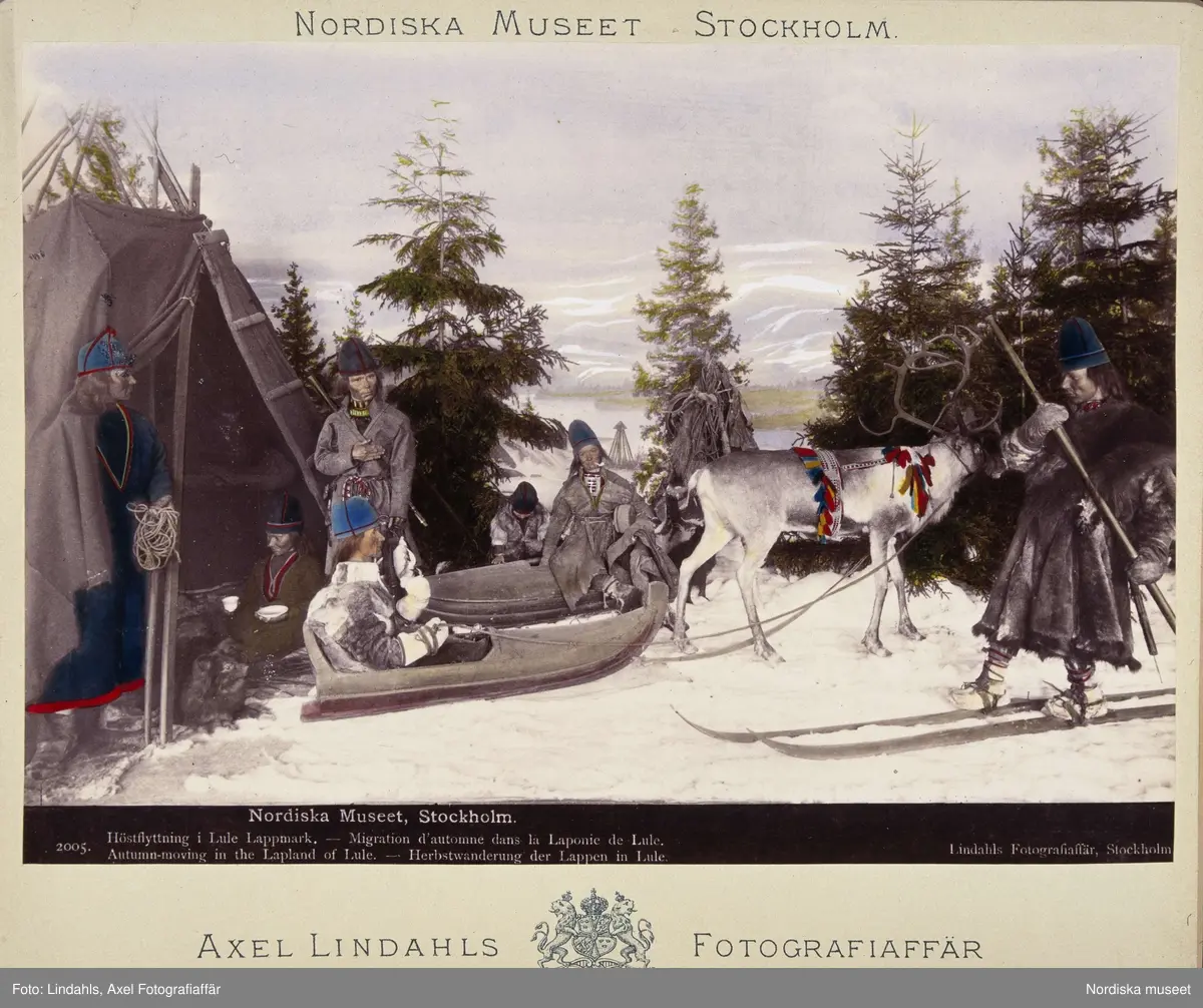 Monterat foto med tablå: "Höstflyttning i Lule Lappmark". Från utställning på Nordiska museet, Drottninggatan.