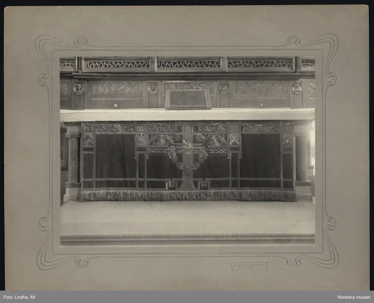 Röda antependiet på altaret med predella för Strängnäs domkyrka. Komp. Maria Widebeck -1910. Ur Handarbetets Väners arkiv K II: 5