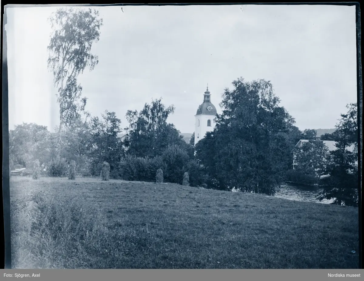 Vy över äng med hässjor, Filipstads kyrka i bakgrunden.