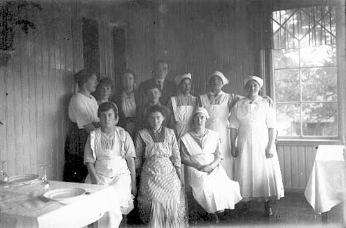 En grupp kvinnor i förkläde står uppställda i vad som ser ut som en inglasad verande. I bakgrunden står en man i civilklädsel. I gruppen står också en pojk.